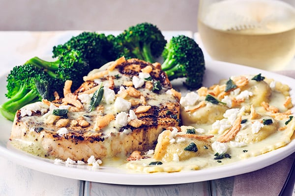 SWORDFISH AND PUMPKIN RAVIOLIWood-grilled swordfish, topped with crispy onions, crumbled feta, crispy sage and a hint of brown butter, served with pumpkin ravioli and steamed broccoli.