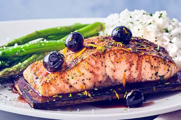 CEDAR PLANK “OLD-FASHIONED” SALMONCedar plank roasted salmon, brushed with a Jim Beam bourbon honey glaze, finished with Bordeaux cherry gastrique and fresh grated orange zest, served with asparagus and jasmine rice.