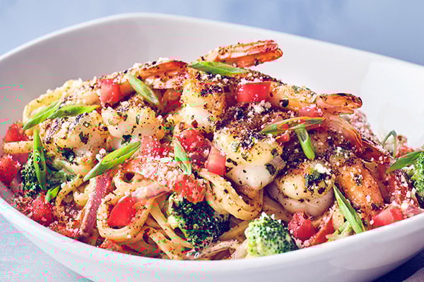 SHRIMP DIABLO LINGUINEChef-crafted diablo cream sauce, red bell peppers, red onion, broccoli, topped with wood-grilled shrimp, parmesan, green onion, and diced tomato.
