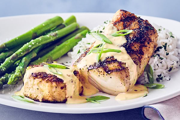 GROUPER WITH CRAB CAKE & BANG HOLLANDAISEWood-grilled grouper, paired with a lump crab cake, topped with a creamy spicy hollandaise sauce, finished with green onion, served with jasmine rice and asparagus.